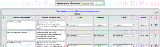 Список образовательных организаций отображается в АИС для Вашего муниципального образования. Фрагмент такого списка с возможностью редактирования представлен на рис. 101.