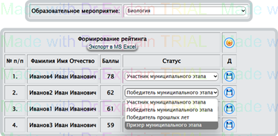Построение рейтинга по результатам муниципального этапа производится по образовательным мероприятиям (рис.106). Построение рейтинга заключается в изменении статуса участника муниципального этапа. Изменив статус участника необходимо нажать.