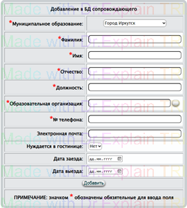 Режим добавления нового сопровождающего (рис.108) использует стандартные активные элементы: заполнение текстового поля, выбор из списка, календарь. Красными звездочками обозначены обязательные для ввода поля. Заполнив все поля необходимо нажать на кнопку.