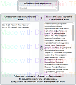 Настоящий режим позволяет формировать и редактировать список заявки. После выбора образовательного мероприятия отобразиться таблица (рис.109.). В левой части отображены участники муниципального этапа и их результаты по общеобразовательному мероприятию. В правой – кандидаты на участие в региональном этапе.