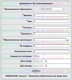 Режим добавления нового сопровождающего (рис.143) использует стандартные активные элементы: заполнение текстового поля, выбор из списка, календарь. Красными звездочками обозначены обязательные для ввода поля. Заполнив все поля необходимо нажать на кнопку.