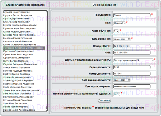 Активизируя настоящий режим, в левой части будут отражены участники, подавшие заявки в активном периоде. Осуществляя навигацию по списку участников Вам необходимо найти экстренно добавленного и в правой части внести изменения в его личные дополнительные данные, минимум в те, которые помечены звездочкой – обязательные к заполнению поля (рис.135).